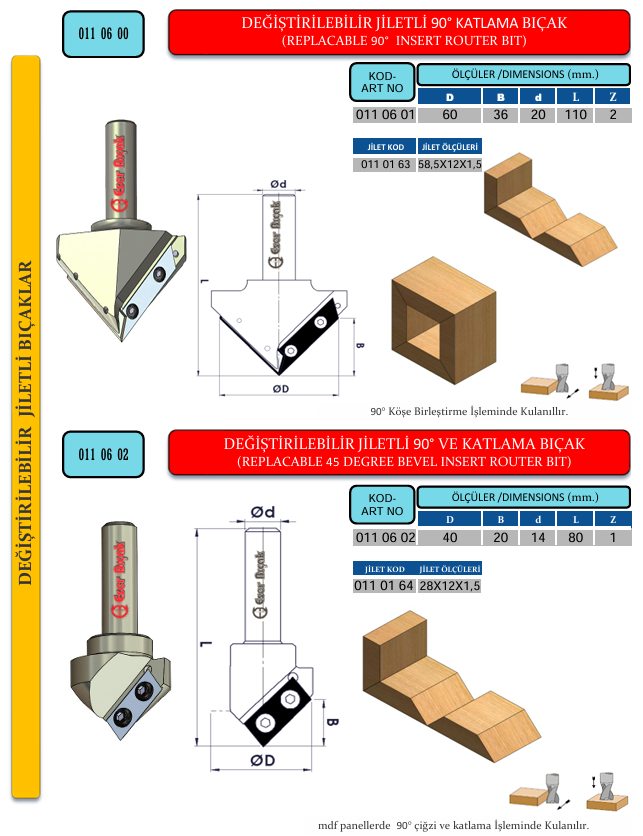 DEĞİŞTİRİLEBİLİR JİLETLİ 90° KATLAMA BIÇAK 90° Köşe Birleştirme İşleminde Kulanıllır. mdf panellerde 90° çiğzi ve katlama İşleminde Kulanılır.