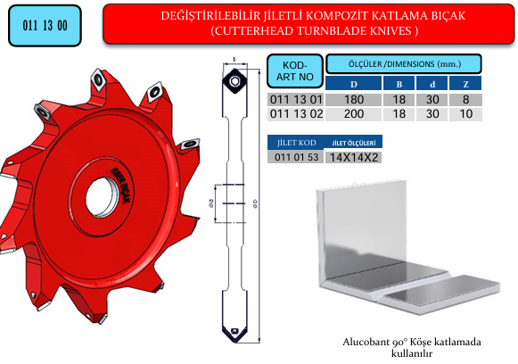 DEĞİŞTİRİLEBİLİR JİLETLİ KOMPOZİT KATLAMA BIÇAK Alucobant 90° Köşe katlamada kullanılır