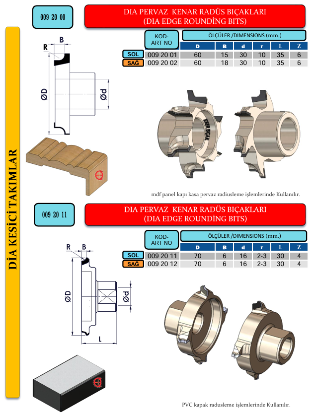 DIA PERVAZ KENAR RADÜS BIÇAKLARI mdf panel kapı kasa pervaz radiusleme işlemlerinde Kullanılır.
