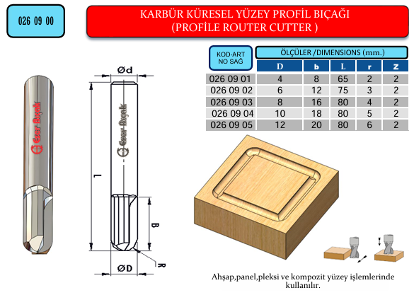 KARBÜR KÜRESEL YÜZEY PROFİL BIÇAĞI Ahşap,panel,pleksi ve kompozit yüzey işlemlerinde kullanılır.