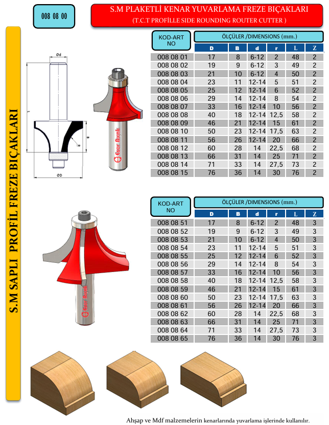 S.M PLAKETLİ KENAR YUVARLAMA FREZE BIÇAKLARI Ahşap ve Mdf malzemelerin kenarlarında yuvarlama işlerinde kullanılır.