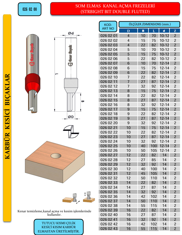 SOM ELMAS KANAL AÇMA FREZELERİ Kenar temizleme,kanal açma ve kesim işlemlerinde kullanılır.